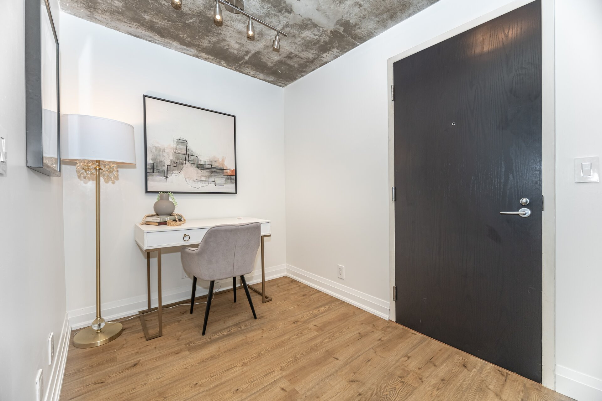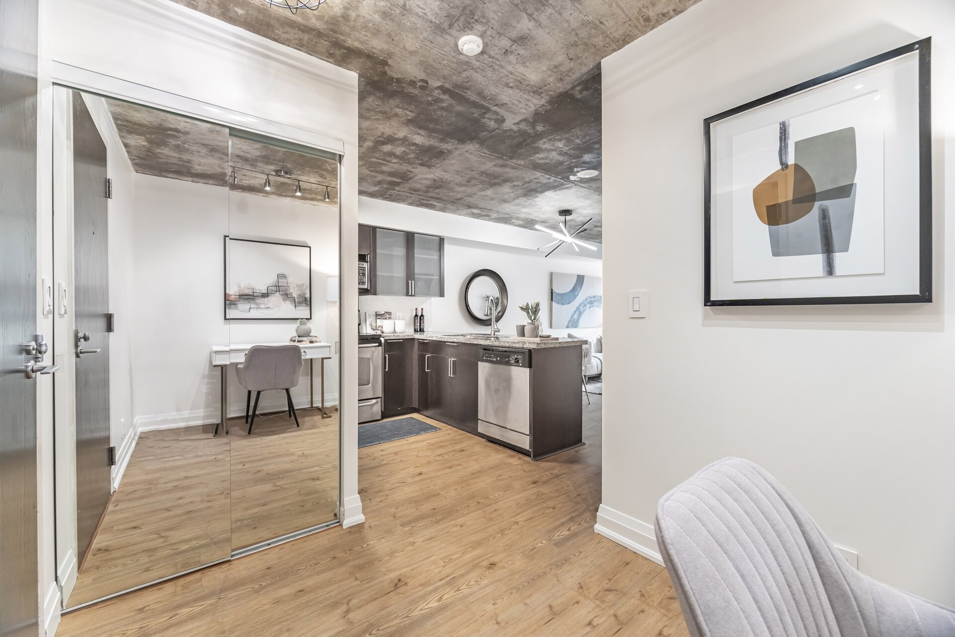 Welcome to DNA Lofts at 1005 King St W, where modern design meets urban sophistication in the heart of one of Toronto's most dynamic neighbourhoods. This stylish one-bedroom + den suite offers a bright, functional layout with new flooring, fresh paint throughout, and exposed concrete ceilings that give the space a true loft vibe. The spacious den provides the perfect flex space for a home office or reading nook. The primary bedroom features a semi-ensuite entrance to the 4-piece bath. The contemporary kitchen is equipped with modern cabinetry, granite counters, double sink, breakfast bar, and full-sized appliances, flowing seamlessly into the open living and dining areas.